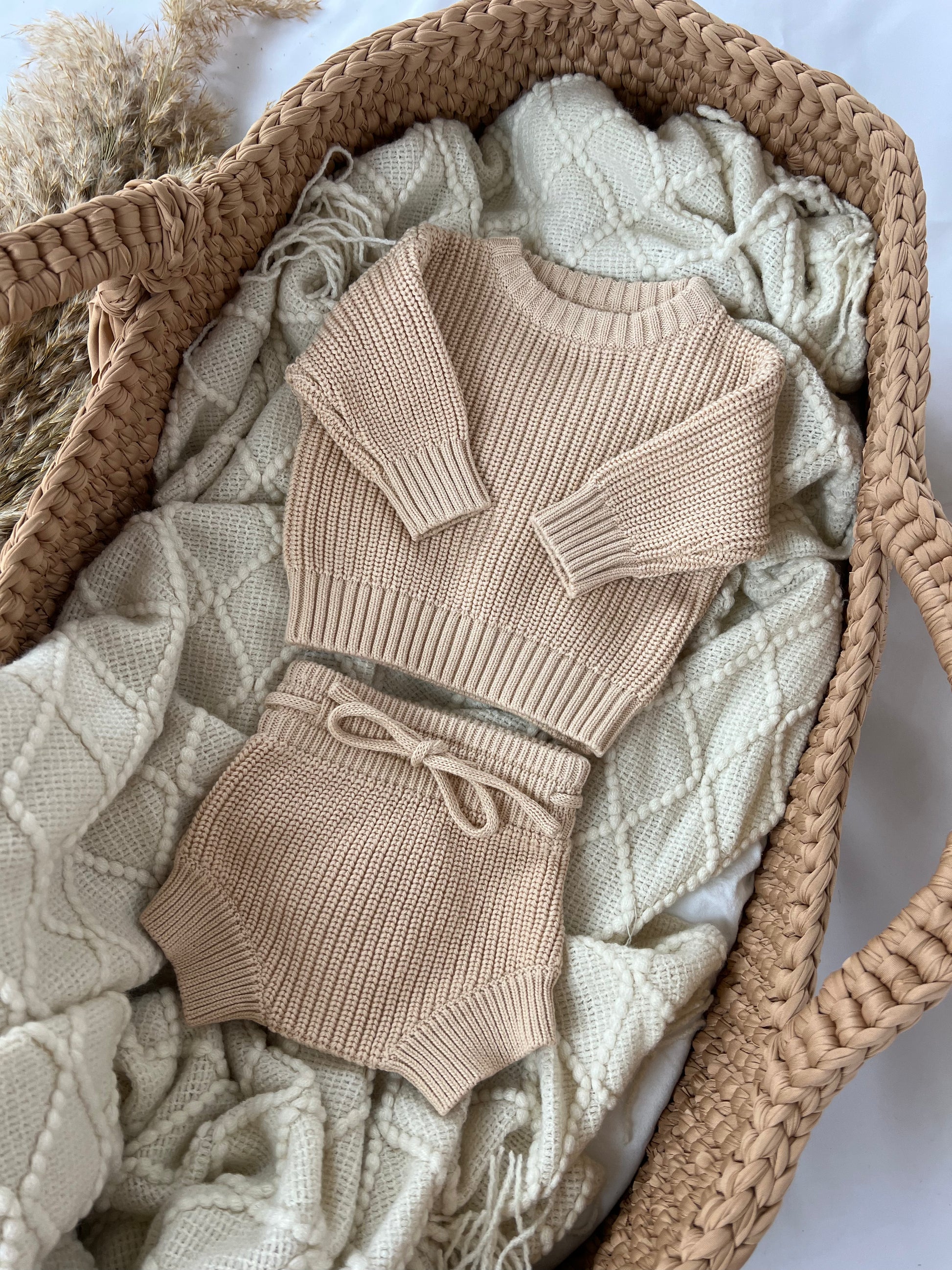 Unser hochwertiger Baby Zweiteiler bestehend aus einem Strickpullover und einer perfekt dazu passenden Pumphose aus unserer Knit Winter Collection. Der Zweiteiler ist aus 100 % feinster Baumwolle liebevoll gestrickt und ist ein kuschelig weiches Must Have für die kalten Monate. Dein Baby wird sich darin rundum wohl fühlen.