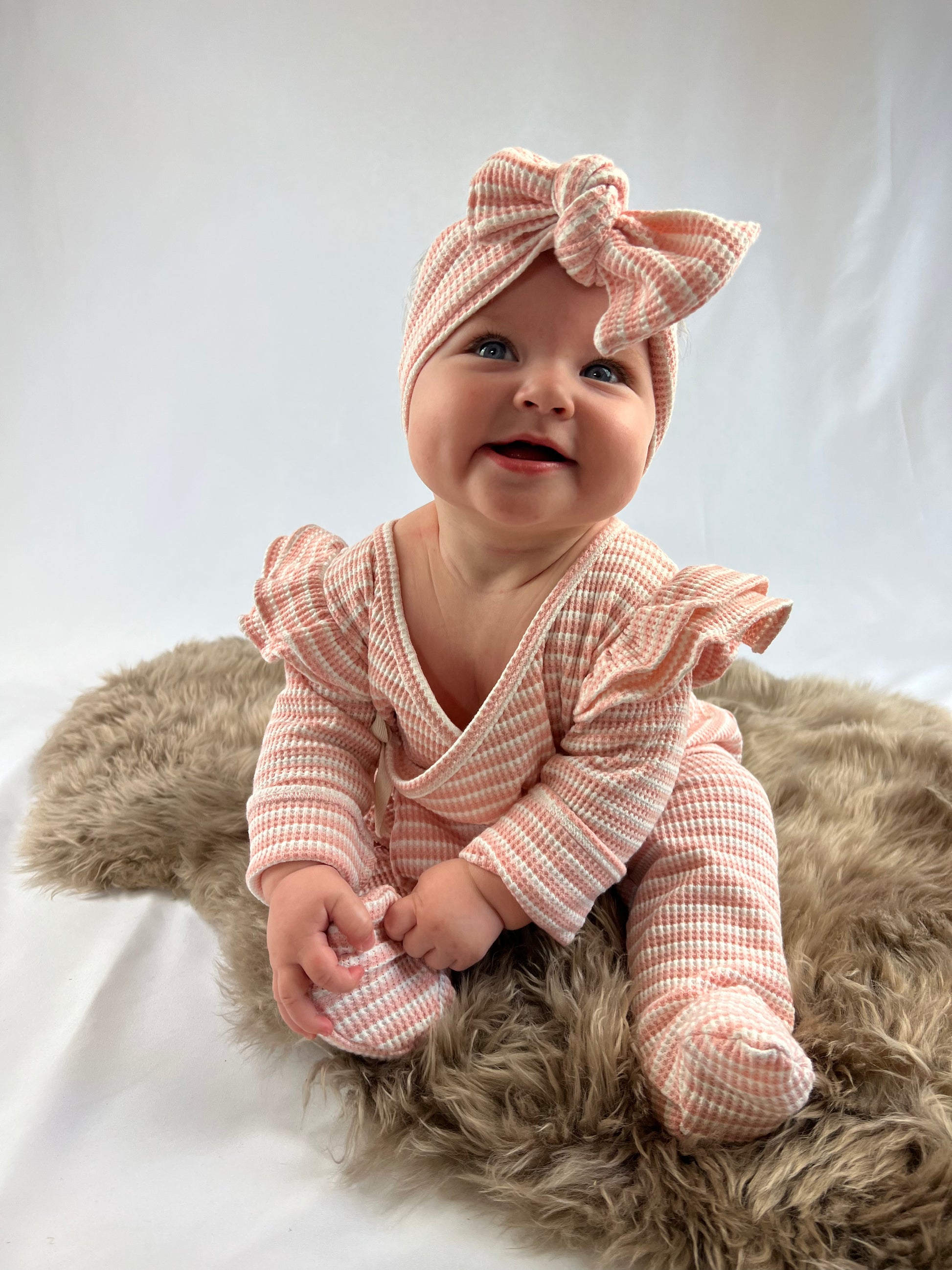 Unser 2-teiliges Set besteht aus einem süßen Oberteil und einer passenden Hose mit geschlossenen Füßchen, damit deinem kleinen Schatz auch bestimmt nicht kalt wird. Das Oberteil ist praktisch zu binden und stylisch zugleich. Obendrein gibt es noch die perfekt passende Haarschleife als Geschenk mit dazu.